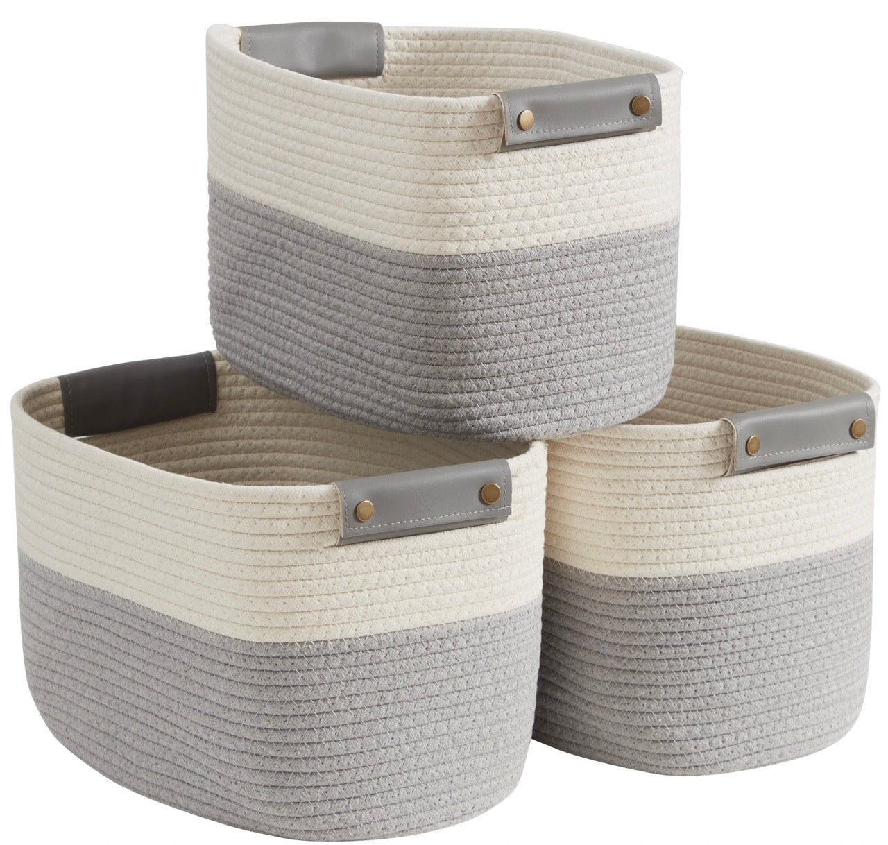 3 Pack Woven Cotton Rope Shelf Storage Basket with Leather Handles